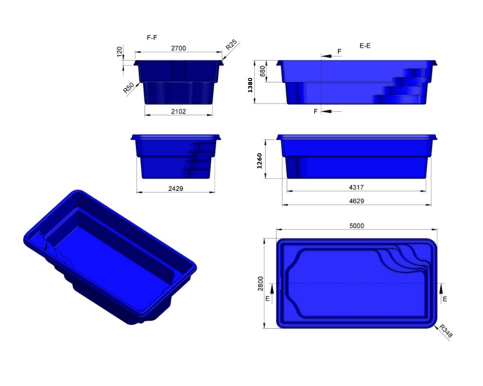 Niewielki, przydomowy basen, stosunkowo płytki z wąskimi stopniami pokrytymi opatentowaną strukturą antypoślizgową. Miejsca siedzące w rogach oraz wąskie schody umożliwiają pełny wypoczynek. Niewielki kształt będzie się idealnie komponować z niewielkim ogrodem.